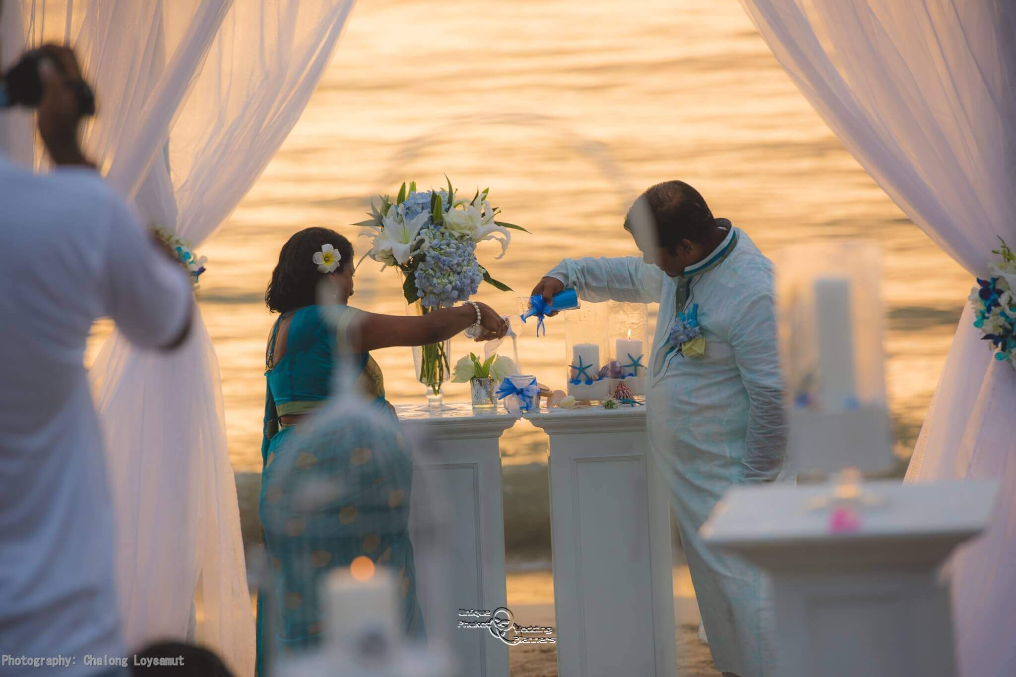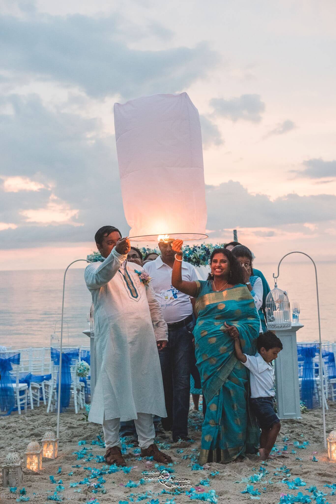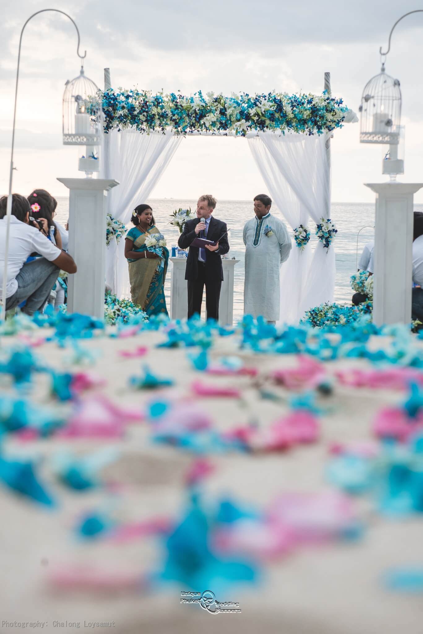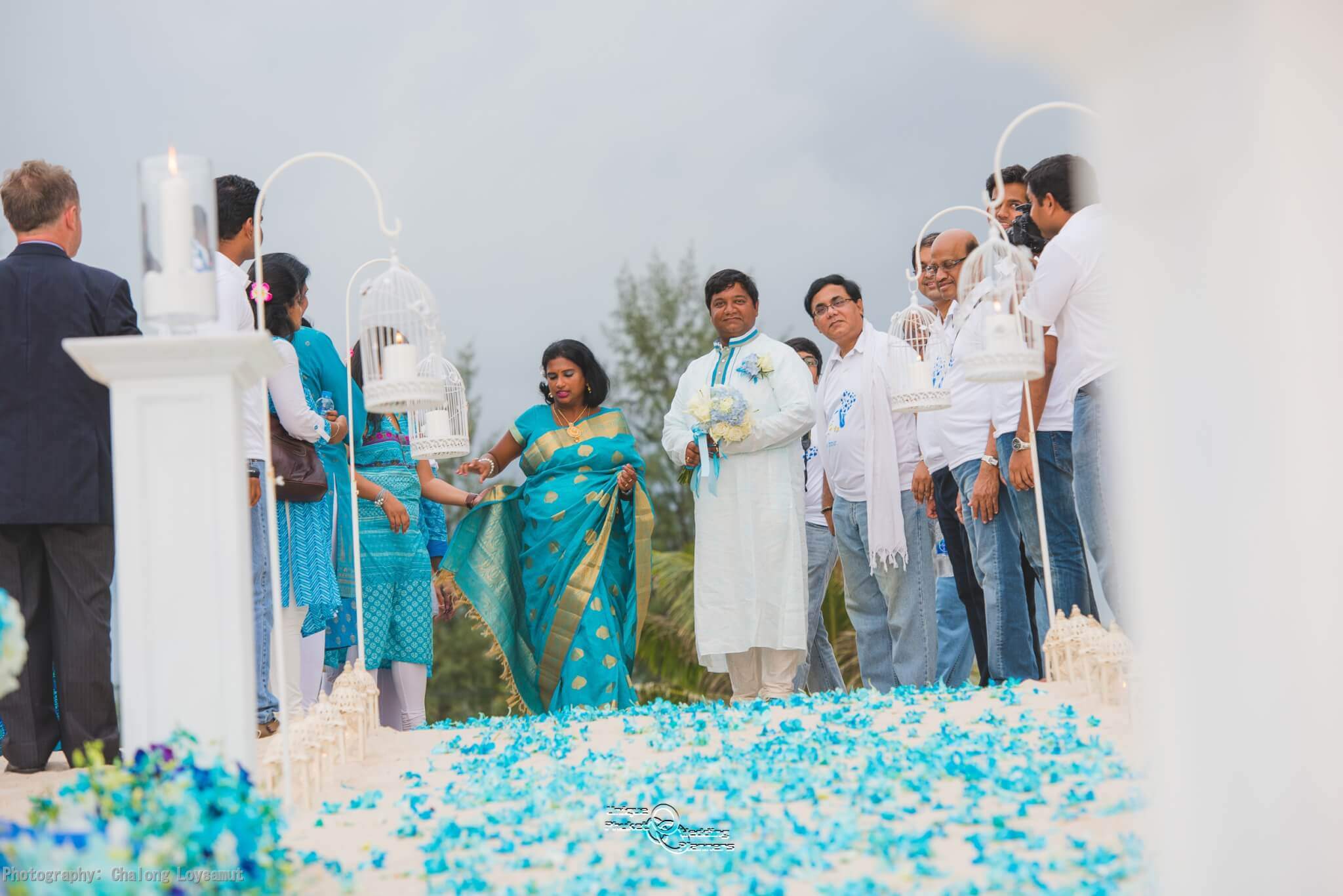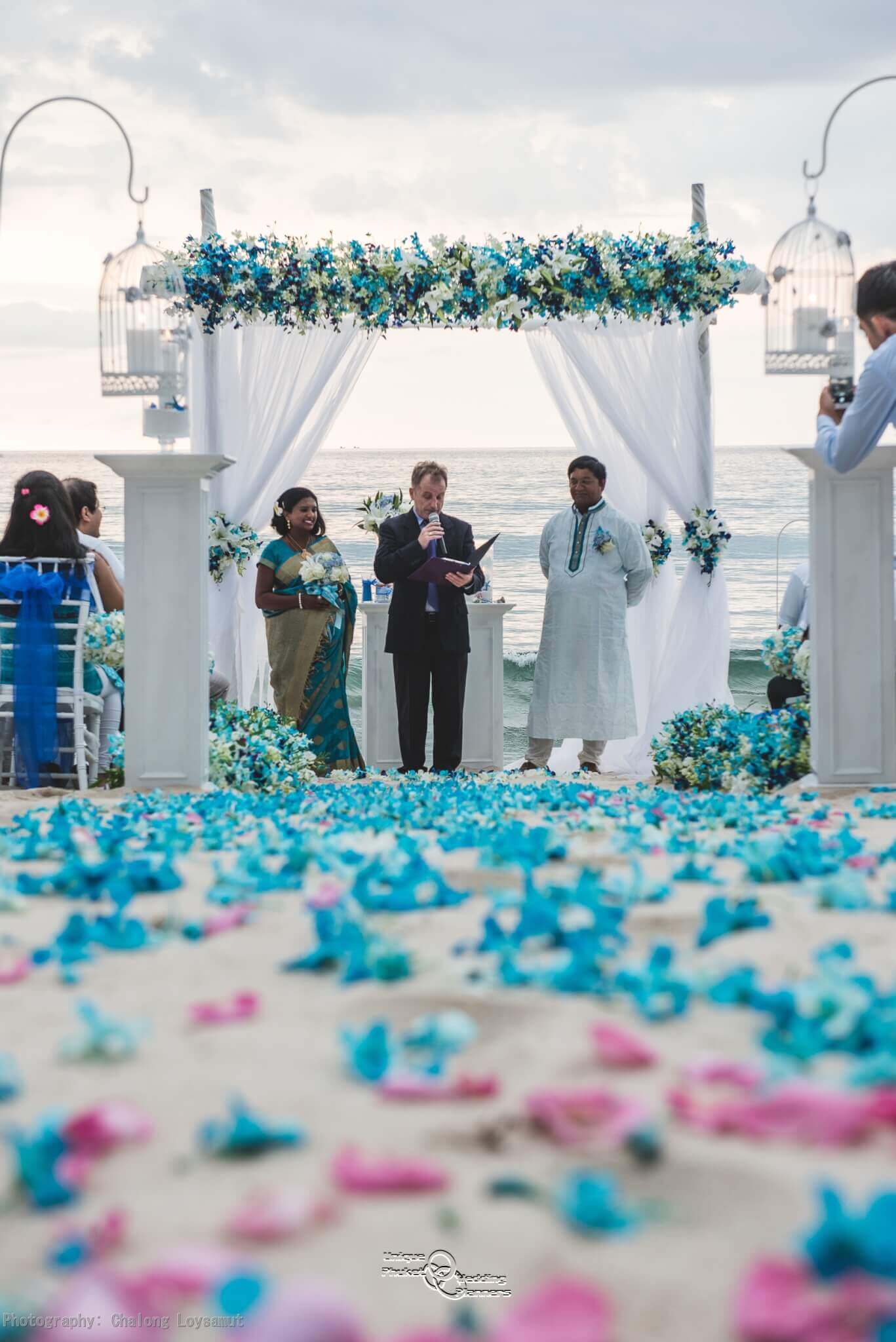 The climax of Kumar and Viji Special day was the trip across Phuket to Layan beach. When they arrived, they were blindfolded and walk to the edge of the beach and in front of their Beach Wedding Gazebo designed and built by Unique Phuket Wedding Planner team.
